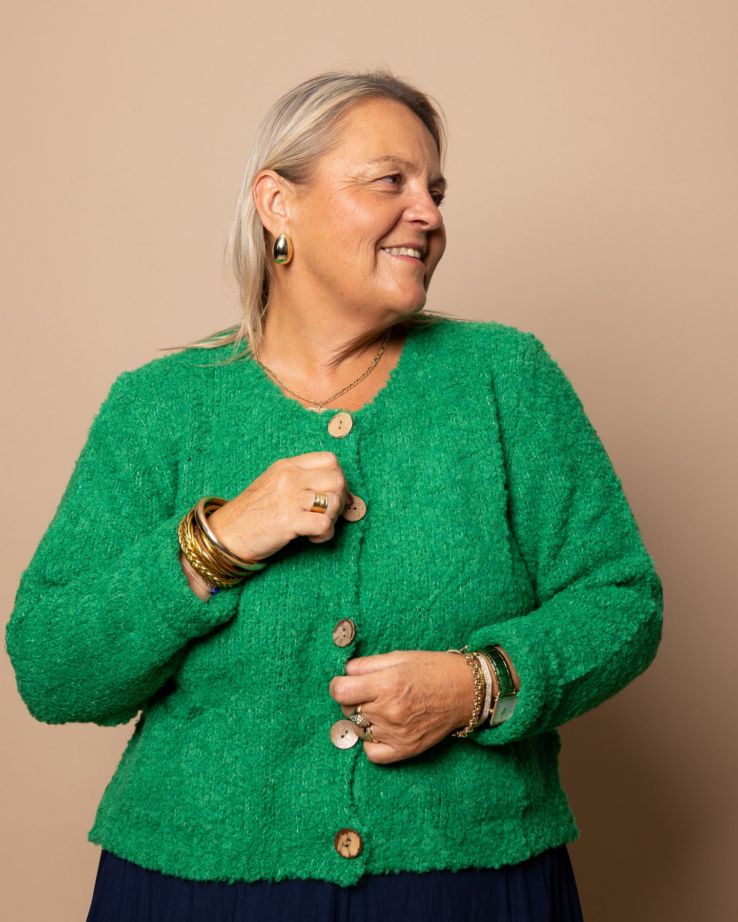 Un gilet pensé pour simplifier la vie sans rien enlever au style. Avec sa maille douce et ses boutons en bois, il peut se porter fermé comme un pull ou ouvert en gilet selon l’envie. Sa coupe droite en fait une pièce facile, idéale pour les journées où l’on veut être à l’aise tout en restant élégante. Le genre de basique réconfortant qu’on enfile sans réfléchir, et qu’on garde toute la saison.